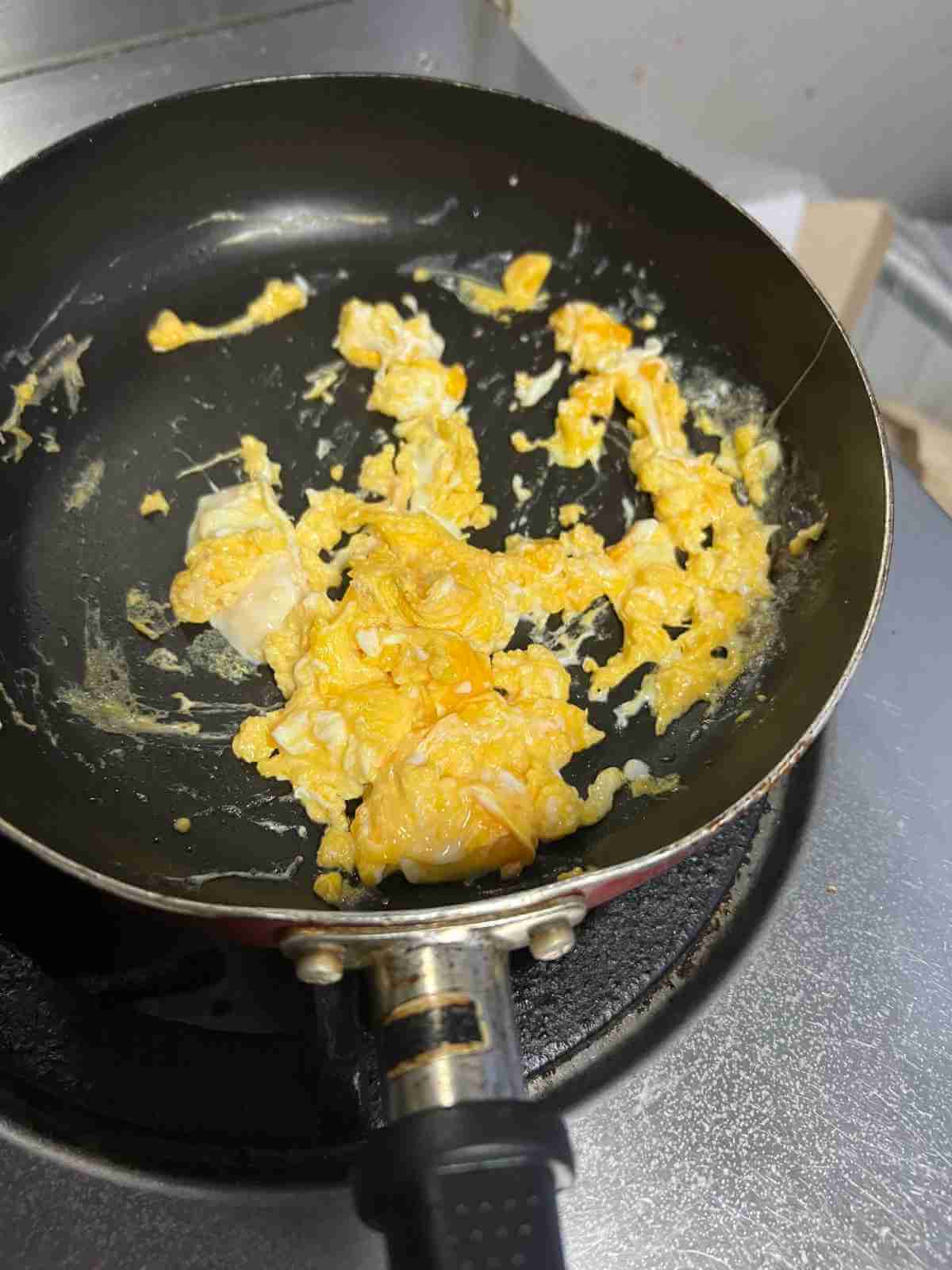 フライパンにオリーブオイルを引いてスクランブルエッグを作る。(味付けなし)