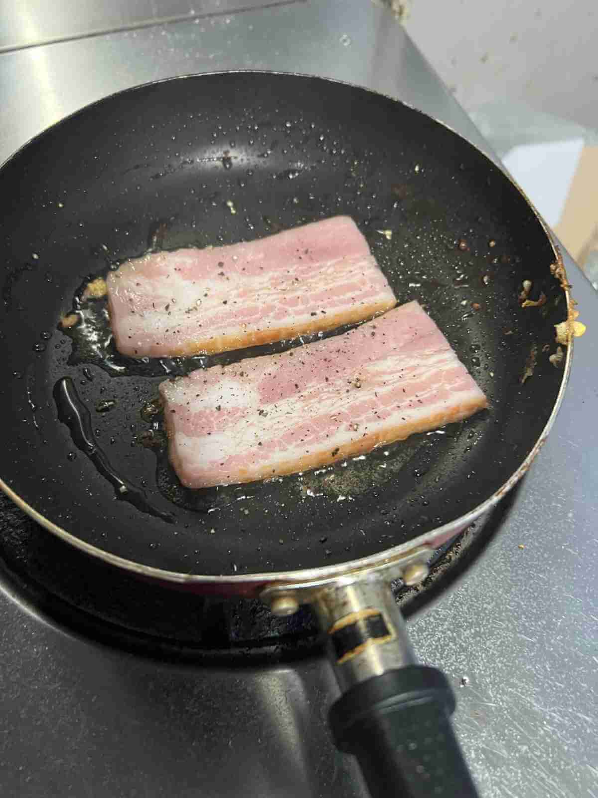 卵はお皿によけて再びオリーブオイルを引いてベーコンを塩とブラックペッパーを振って焼く