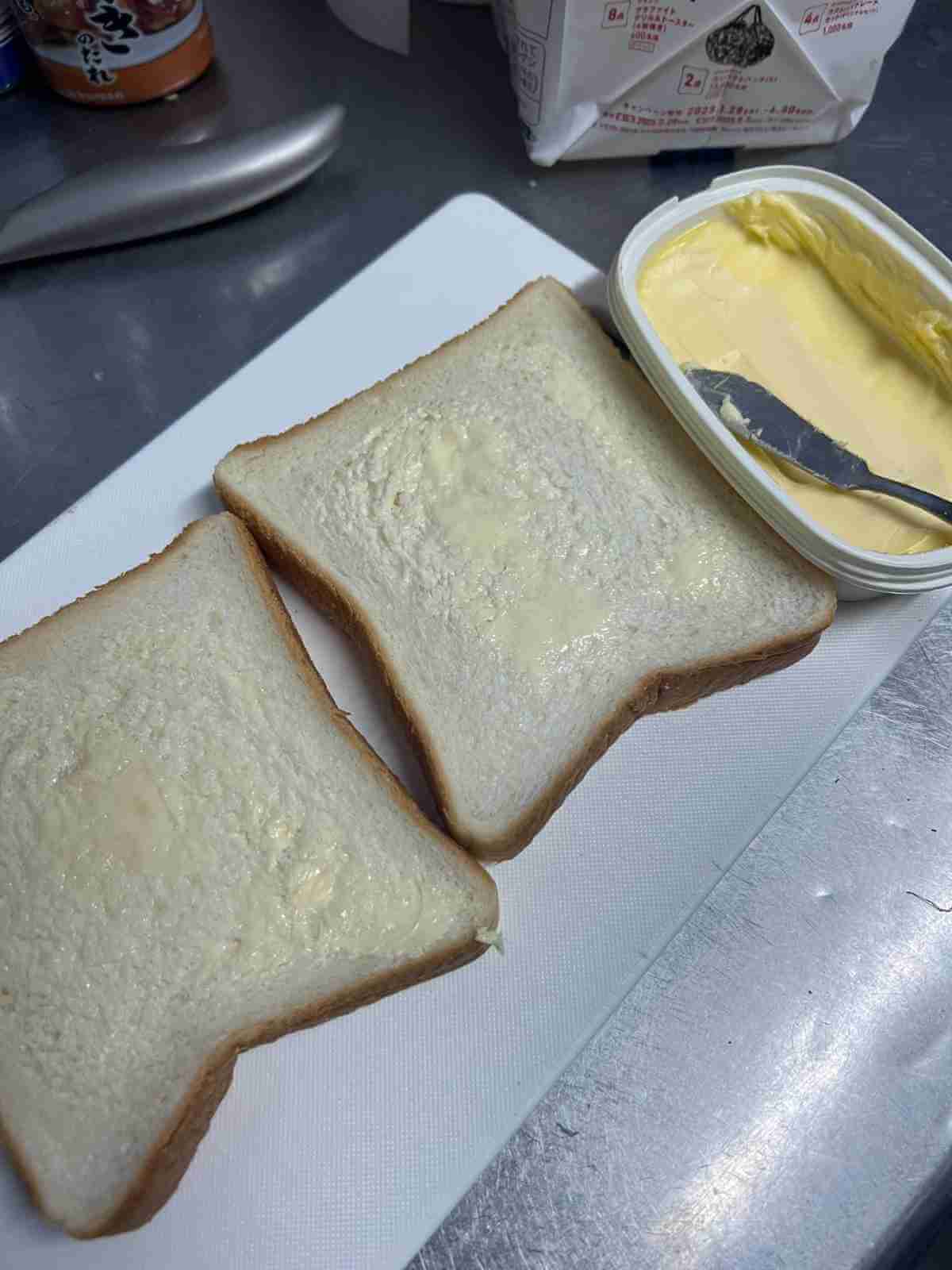 食パン2枚の片面にマーガリンを塗る
